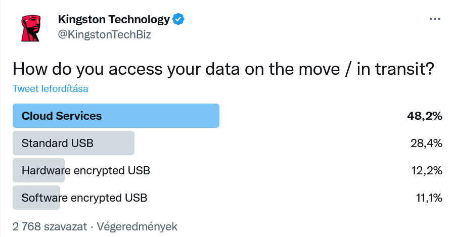 Amikor egy vállalat előírja a felhő használatát, nem feltétlenül szabályozza, hogy a munkavállalók honnan férhetnek hozzá, és sokszor a belépéshez szükséges jelszó megadására tett kísérletek számát sem korlátozza, így a számítógépünk vagy a laptopunk alapvetően védtelen a hackerekkel szemben. A fájlokkal feltöltött titkosított adattároló azonban olyan, mintha folyamatosan velünk lenne a felhő, csak nincs szükség Wi-Fi-re az adatokhoz való hozzáféréshez. A Kingston Technology Twitteren végzett felmérése szerint a válaszadók közel fele (48,2 százalék) a felhőn keresztül éri el az adatait útközben, és csupán 12,2 százalék használ titkosított USB-kulcsot, ezért különösen fontos, hogy tisztában legyünk a felhő veszélyeivel.