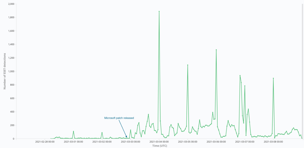 Az ESET óránkénti észlelése a CVE-2021-26855 nevű egyik Exchange biztonsági résen keresztül hozzáadott webshell kódokról
