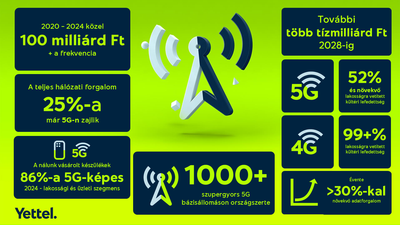 A Yettel országszerte már több mint ezer bázisállomáson a nagysebességű, 5G szolgáltatását nyújtja. A Yettel hálózata a leggyorsabb mobilhálózat Magyarországon a szelessav.net országos összesített átlagsebesség mérése és az Ookla alapján.*