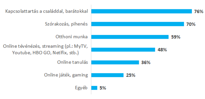 A legtöbben kapcsolattartáshoz veszik igénybe otthon az internetet és átlagosan napi 1-2 órát töltenek ilyen jellegű tevékenységgel. A megkérdezettek közel 80%-a mondta, hogy a családdal, barátokkal való kapcsolattartás, míg 70% szórakozás és pihenés céljából van fenn a világhálón. Előbbi most sok olyan háztartásban is az online térben történik, ahol korábban ez nem volt jellemző: a megkérdezettek 55%-a az írásbeli chatelést választja, 50%-a pedig valamelyik alkalmazás videóchat funkcióját használja. A legtöbben - 66% - azonban telefonbeszélgetés formájában tartják leginkább a kapcsolatot.