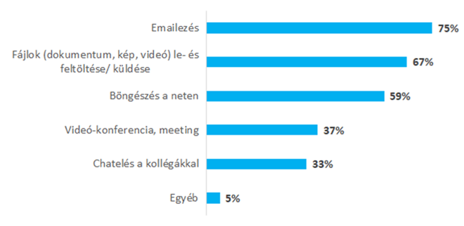 A legtöbben (több mint 75%) emaileznek, de sokan (közel 67%) fájlokat töltenek le, illetve fel, vagy a neten böngésznek (közel 60%). A megkérdezettek harmada (37%) videó-meetingeket tart, és közel ilyen arányban (33%) vannak azok, akik rendszeresen chatelnek a kollégáikkal.