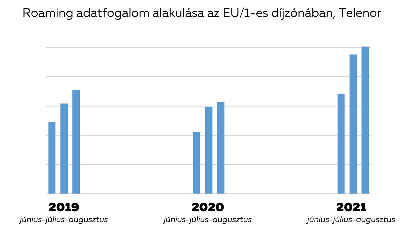 Az EU/1-es díjzónában a 2020-as koronavírus korlátozások kisebb visszaesést okoztak, az amúgy évről-évre megfigyelhető növekedési trend elmaradt. Idén nyáron ebben a díjzónában az ügyfelek „pótolták a kimaradást”, a 2021 nyarán mért roaming adatforgalom ebben 45%-kal meghaladta a koronavírus előtti, 2019-es nyár forgalmát. Ez összeköthető a bátrabban vállalt külföldi utazásokon bonyolított adatforgalommal és vélhetően az EU-n belül dolgozó, hazai Telenor tarifát használó ügyfelek által generált mobilnet-forgalommal.
