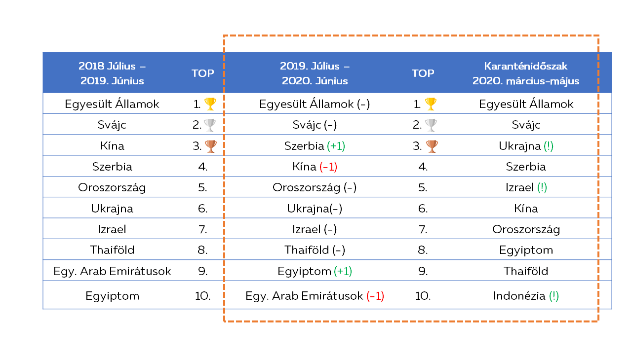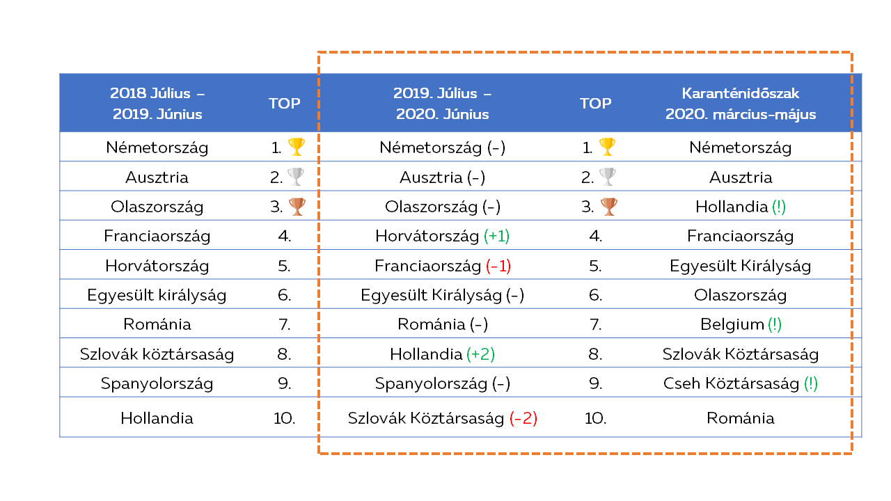 A friss éves (2019. július – 2020. június) forgalmakat tekintve változás a korábbi (2018. július – 2019. június) évhez képest, hogy Horvátország egy, Hollandia két helyet lépett előre, míg Franciaország egy, a Szlovák Köztársaság két helyet esett vissza a top 10-es listán. A karanténidőszakban, azaz idén márciustól május végéig a top 10-es európai roaming listán már jelentősebb változás tapasztalható: az utazási korlátozások idején a legmagasabb roaming-forgalmakat elért országok között megjelent Belgium és a Cseh Köztársaság, míg Hollandia jelentőset lépett előre a listán. Ebben az időszakban a Spanyolországban és Horvátországban generált roaming-forgalom már nem fért fel a 10-es listára.