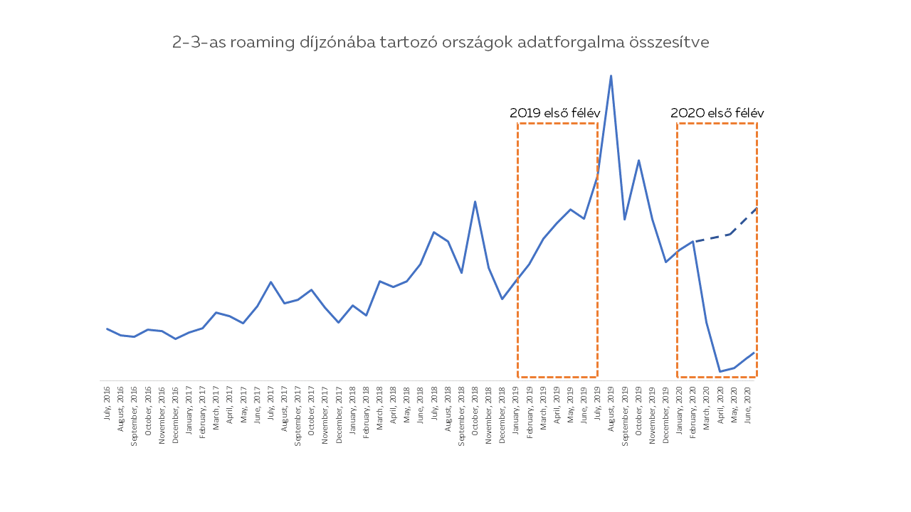 Az 1-es díjzónán kívüli, 2-es2 és 3-as díjzónába tartozó országokban az elmúlt években a roaminghasználat trendje az európaihoz hasonló arányban növekedést mutat. A 2016 júliusa óta vizsgált adatok alapján elmondható, hogy a nyári időszak mellett ezekben az országokban a kora őszi időszak jelent szezonális csúcspontot. 2020-ban a koronavírus megjelenése erős hatással volt a távolabbi országok látogatására, így a roaming-használatra is: március-április hónapban évek óta nem látott alacsony szintet ért el a 2-es és 3-as roaming zónákban bonyolított adatforgalom, a trendek szerint várható mértékhez képest 90%-nál nagyobb mértékű visszaesés tapasztalható. A grafikonon a szaggatott vonal a koronavírus nélkül, a trendek alapján feltételezett roamingforgalmat jelöli.