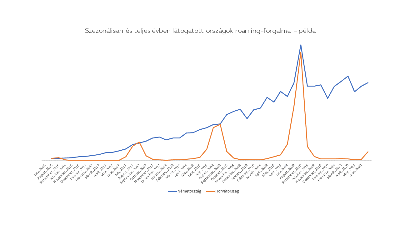 Az EU-s országokban / 1-es díjzónában különösen jól megfigyelhető jelenség, hogy melyik országokban vannak jelen állandó roaming felhasználók – azaz olyanok, akik egész évben, feltételezhetően munkavégzés céljából, hazai előfizetéssel látogatják az országot –, illetve melyik országban jelentősebb a szezonalitás, például a kiemelkedő nyári forgalmat szinte eseménytelen téli időszakok tagolják. A lenti grafikon Németország és Horvátország roaming-forgalmát mutatja 2016. júliustól 2020. júniusig. A míg a német roaming forgalom egy kiegyenlített emelkedést mutat, a horvát grafikonon a nagy kiugrások a nyári időszakban jelentkeznek.