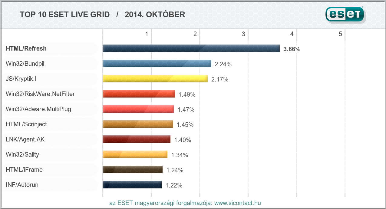 Az ESET minden hónapban összeállítja a világszerte terjedő számítógépes vírusok toplistáját, amelyből megtudhatjuk, hogy aktuálisan milyen kártevők veszélyeztetik leginkább a felhasználók számítógépeit. 2014 októberében az előző hónapban a lista élén felbukkanó HTML/Refresh maradt az első helyen. Hatodik helyen tért vissza viszont a sokáig kiszorult HTML/ScrInject trójai, illetve eggyel előkelőbb pozícióba lépett viszont a Win32/RiskWare.NetFilter, az előző havi ötödik helyezést cserélte fel immár a negyedikre.