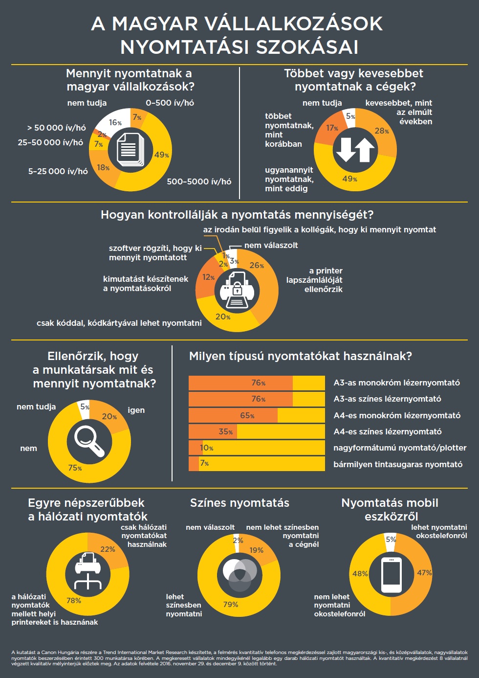 Összességében a vállalkozások fele 2016 végén ugyanannyit nyomtatott, mint a korábbi években, és ezen a téren nincs jelentős különbség a különböző méretű cégek között. A vállalkozások 28%-a szerint valamilyen mértékben kevesebb lett a nyomtatási mennyiség, viszont 17% többet nyomtat, mint a korábbi években. Azoknál a vállalatoknál, ahol a munkatársak bevallása szerint a korábbinál kevesebbet nyomtatnak, a legtöbb esetben (38%) az elektronikus dokumentumkezelő rendszer bevezetése miatt csökkent a nyomatok száma.