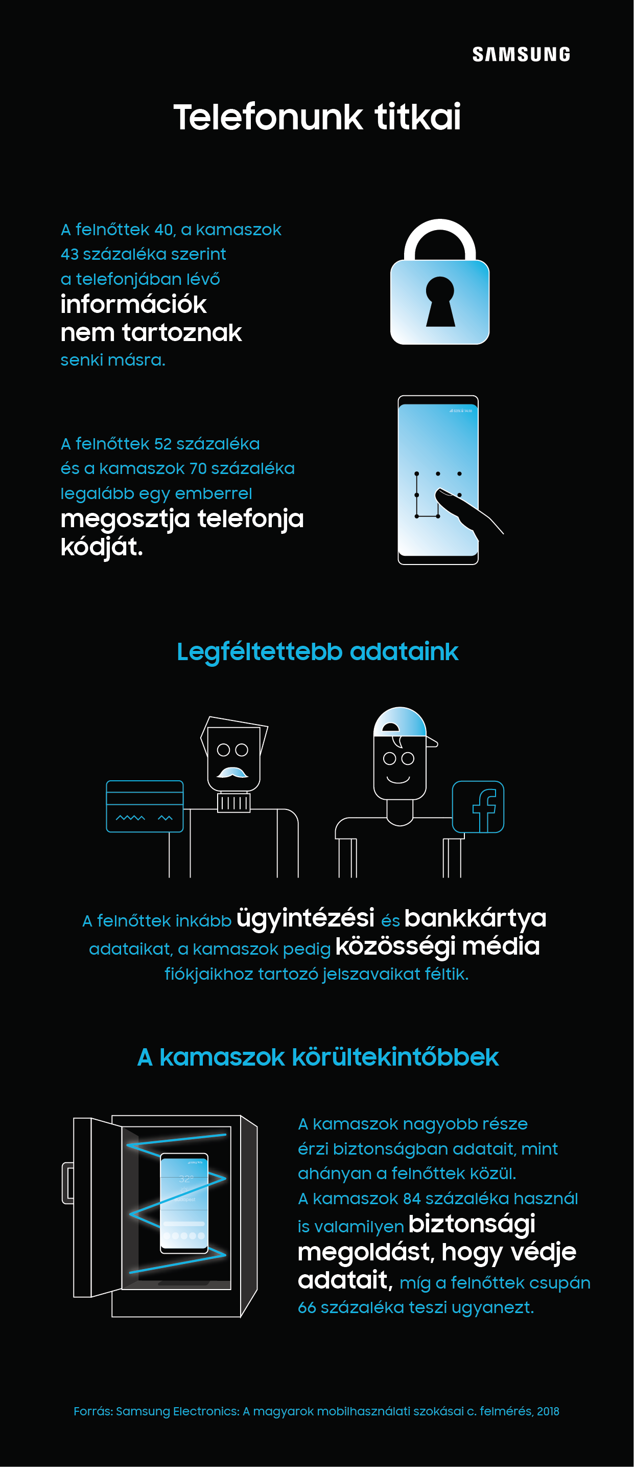 A tinédzserek jó része a telefonján tárolt adatokat személyes információnak tekinti, ezért jobban ügyelnek azok védelmére, mint a felnőtt korosztály tagjai. A Samsung Electronics megbízásából készített kutatásból1 kiderül az is: a kamaszok más típusú adatokat féltenek, mint a felnőttek.