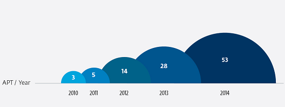 Az elmúlt években, ha mást nem, egy leckét nagyon megtanulhattunk: azt, hogy a célzott támadások folyamatosan növekvő tendenciát mutatnak és ez alól az idei, 2015-ös év sem lesz kivétel. A közismert nevén Advanced Persistent Threats-ként (APT) ismert támadások a célpont kiválasztásánál, a támadás időtartalmában és a „lappangási” időszak hosszúságában térnek el a hagyományos kibertámadásoktól. Fontos azt is megjegyezni, hogy ezek a támadások célzott Social Engineering támadásokat hasznosítanak. Az APT adattár szerint az ilyen jellegű támadások az elmúlt pár évben megsokszorozódtak, 2010-től 2014-ig összesen 53 ismert támadást azonosítottak, és ezek mellett valószínűleg nagyon sok volt a még felfedezetlen kísérlet is. A területek alapján legfőbb azt láthatjuk, hogy jellemzően a pénzügyi és az üzleti szféra áll leginkább a célkeresztben, de időnként politikai motivációk is tetten érhetőek, vagy legalábbis gyaníthatók. Emellett aggasztó lehet, hogy folyamatosan növekszik az egészségügyi adatok elleni támadások száma is.
