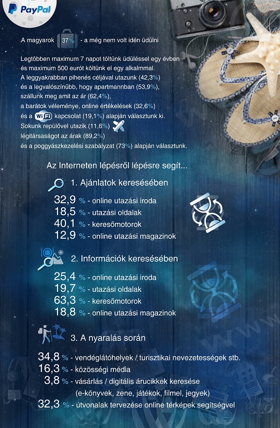 Utazásaink során igyekszünk takarékosak lenni, átlagosan maximum 500 eurónak megfelelő összeget költünk el (69,9%). Mindez nem jelenti azt, hogy a nyaralás során ne szeretnénk ugyanúgy böngészni a webshopok ajánlatait, mint otthon: egyre több digitális terméket vásárolunk, mint a strandon is olvasható e-könyvek, vagy az olyan zenék, amelyeket a nyaralás ideje alatt hallgatunk (3,8%).