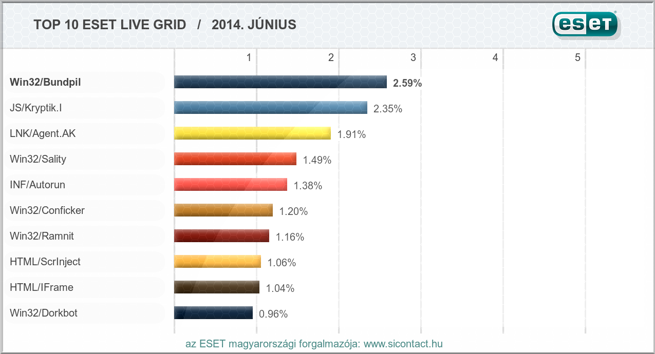 Az ESET több millió felhasználó visszajelzésein alapuló statisztikai rendszere szerint 2014 júniusában a következő 10 károkozó terjedt világszerte a legnagyobb számban, és volt együttesen felelős az összes fertőzés 15.14%-áért. Aki pedig folyamatosan és első kézből szeretne értesülni a legújabb Facebook-os kártevőkről, a közösségi oldalt érintő mindenfajta megtévesztésről, az csatlakozhat hozzánk az ESET Magyarország www.facebook.com/biztonsag, illetve az antivirusblog.hu oldalán.