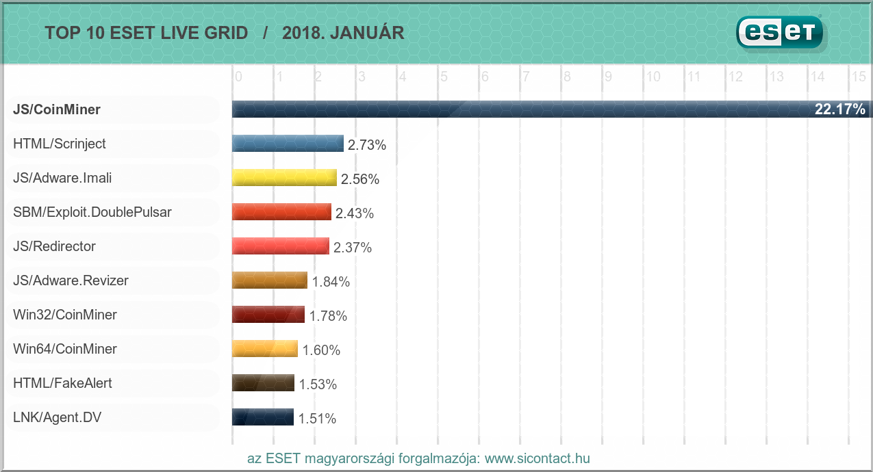 Összességében a trójaik adják a mezőny többségét, szám szerint a tíz helyből hetet foglalnak el. A Top10 listát óriási fölénnyel - 22.17%-os értékkel - ebben a hónapban is a JS/CoinMiner trójai vezeti. A JS/CoinMiner olyan szkript, amely a felhasználó tudta nélkül képes a kriptográfiai valuták bányászatára. A kártevő segítségével észrevétlenül Feathercoin, Litecoin vagy Monero bányászatra használják az áldozat számítógépének erőforrásait, és az érintett felhasználók nagy száma miatt a támadók ezzel jelentős bevételekre tehetnek szert. A weboldalak megfertőzésével ugyanis egyszerűbben lehet sok felhasználót elérni, mint az áldozatok gépeit egyenként megfertőzni.