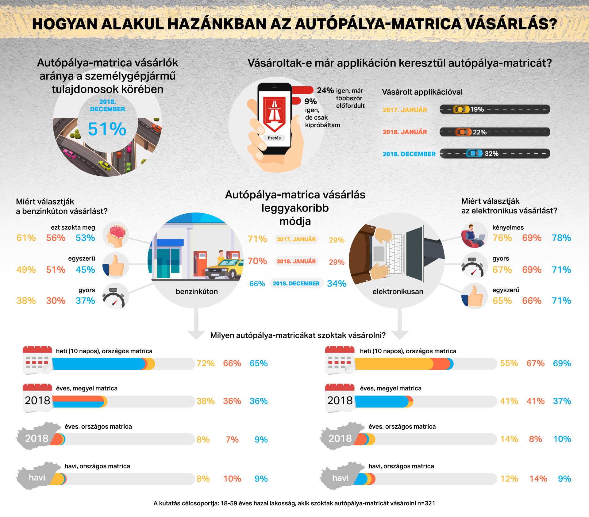 Ez derült ki abból a kutatásból, amelyben az autópálya-matricák beszerzésének módjai kerültek górcső alá. Az elektronikus úton, jellemzően mobiltelefonunkon keresztül lebonyolított tranzakciókat a korábbi hasonló felmérések eredményeihez képest megbízhatóbbnak, kényelmesebbnek tartják a válaszadók. Egyre többen próbálják ki és használják rendszeresen az applikáción keresztüli autópálya-matricavásárlásokat is: egy év alatt tíz százalékponttal nőtt azok aránya, akik használtak már okostelefonos alkalmazást a tranzakciókhoz.