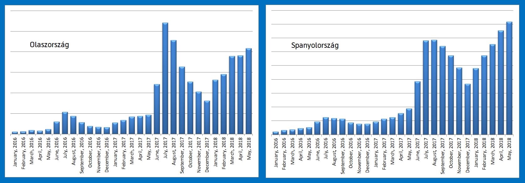Az általánosan megugró roamingforgalom és a szezonalitás hatása egyszerre figyelhető meg az Olaszországban és Spanyolországban mért adatokon. Ezekben az országokban 2017 júliusától a korábbi többszörösére nőtt az adatroaming-forgalom, ugyanakkor a nyári hónapokban ehhez képest is kiugró értékek figyelhetők meg. Ezekkel a hatásokkal Olaszország a top 5 EU adatroaming listán a 3. helyet érte el.