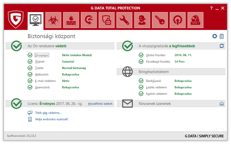 Az új lakossági szoftvergeneráció három tagja a G Data Antivirus, a G Data InternetSecurity és a G Data TotalProtection. A G Data Antivirus kártevők elleni védelmét az InternetSecurity megbízható tűzfallal, a TotalProtection pedig további kényelmi szolgáltatásokkal egészíti ki.