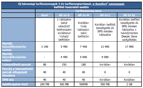 [2]A tarifacsomagokra vonatkozó ajánlat 2013.11.07. és 2014.01.06. között érvényes, új egyéni (lakossági) számlás előfizetésként történő vásárlás, vagy Bónusz Program igénybevétele esetén, belföldi, normál célú felhasználásra, készülékvásárlással vagy készülékvásárlás nélküli konstrukcióban, e-Komfort csomaggal, 2 év tarifamegtartással. A tarifacsomagok havidíjában foglalt korlátlan percek és SMS üzenetek kizárólag belföldi, normál díjas hívások, SMS üzenetek esetén érvényesek.