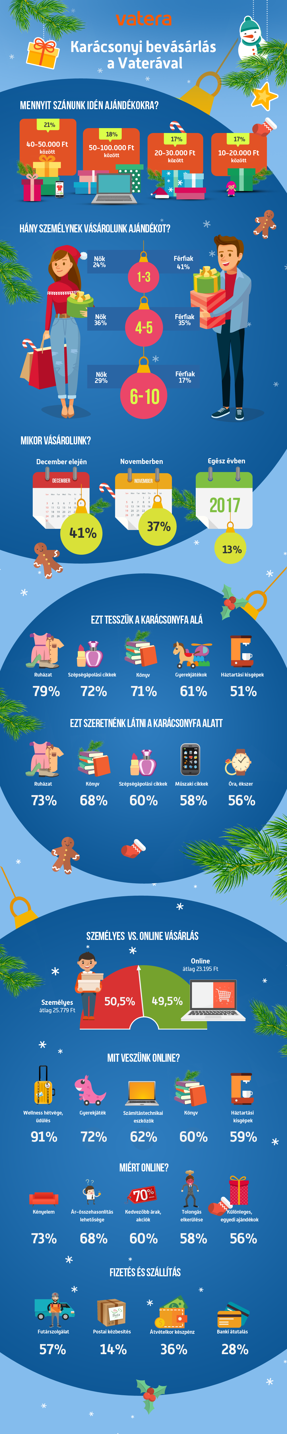 Karácsonyi dalok a plázákban, tömeg és fahéjillat: indul az év legnagyobb bevásárlássorozata. Az ajándékkeresők több mint 85 százaléka a következő hetekben tervez megvenni szinte mindent, amit majd a fa alá tesz december 24-én – többek között ez derült ki a Vatera saját felhasználói körében végzett friss felméréséből. A válaszadók zöme (36%) 4-5 fő számára tervez vásárolni, valamivel kevesebben (32%) pedig 1-3 személynek. Átlagosan 46.870 forintot szánunk a karácsonyi ajándékokra, és ennek majdnem a felét online költjük majd el.