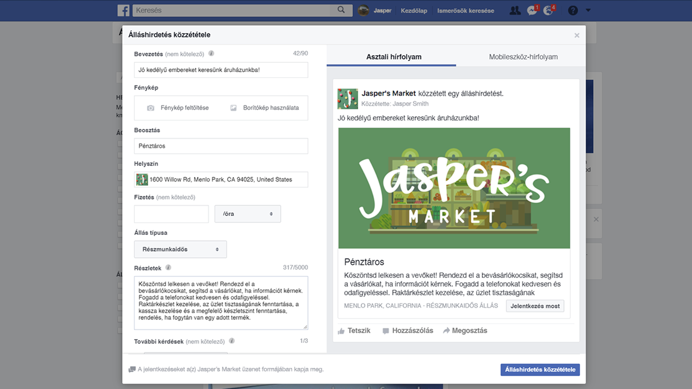 Az oldaladminisztrátorok könnyen hozhatnak létre álláshirdetést, nyomon követhetik a jelentkezéseket, és közvetlenül kommunikálhatnak a pályázókkal. Az erre szolgáló felületen kiválaszthatják az adott állás megnevezését, jellegét (teljes munkaidős, részmunkaidős, gyakornoki pozíció), a fizetési ajánlatot és egyéb paramétereket is megadhatnak. Az álláshirdetés feladása után az oldaladminisztrátor áttekintheti a jelentkezéseket, és felveheti a kapcsolatot a pályázókkal Messengeren.Minden más bejegyzéshez hasonlóan az álláshirdetések is kiemelhetők, így nagyobb vagy relevánsabb célközönség is elérhető velük, mivel a kiemeléseket például lakhely, képzettség, munkatapasztalatok és egyéb paraméterek alapján targetálni is lehet.