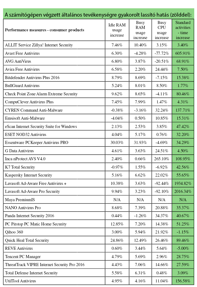 Más ismert védelmi programok sem remekeltek: az AVG 69 százalékkal, a Kaspersky 56 százalékkal, a Panda 41 százalékkal, a NOD32 pedig 32 százalékkal lassította le a feladatok elvégzését.