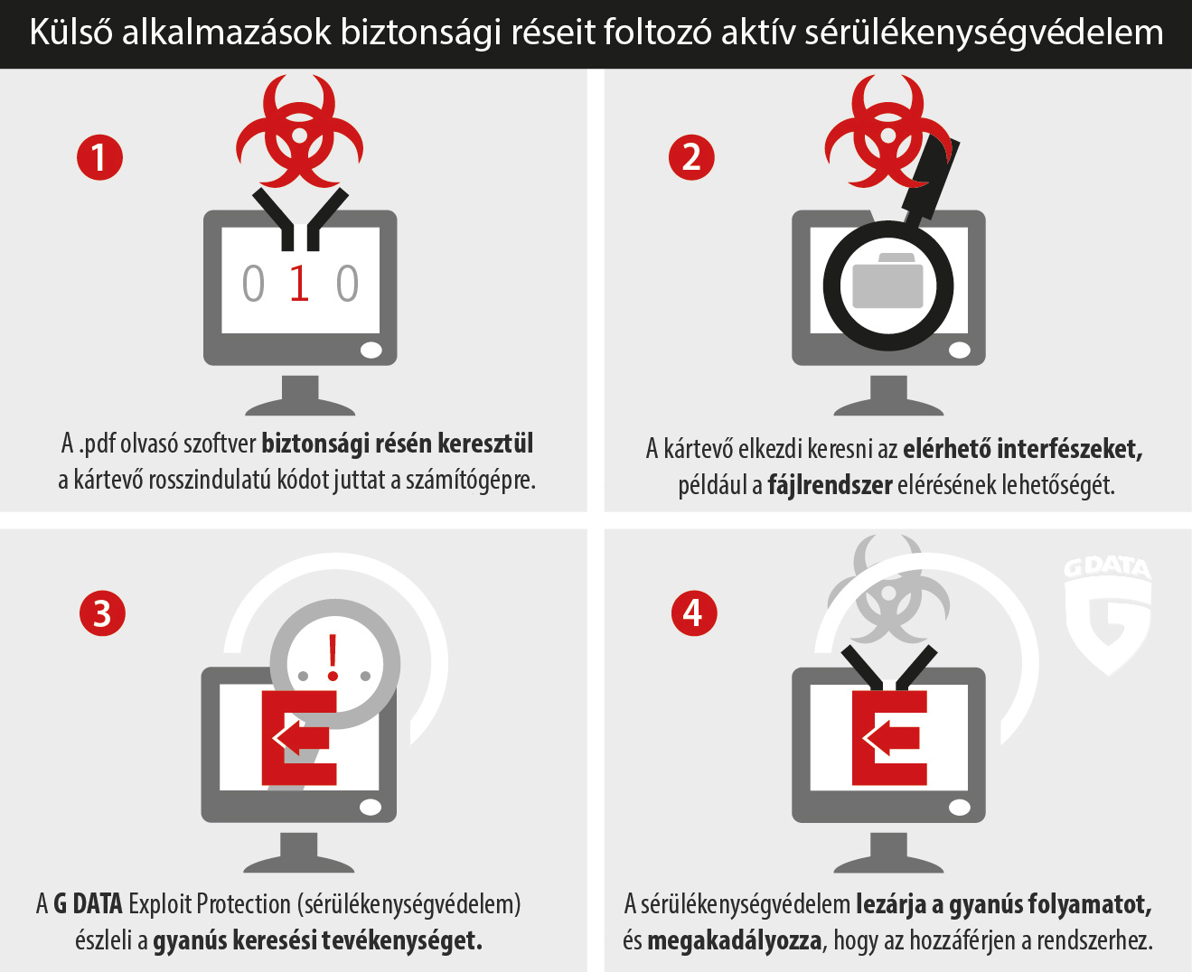A G Data sérülékenységfoltozó technológiája ezt a problémát úgy oldja meg, hogy a külső alkalmazások elé egy plusz biztonsági réteget von addig, amíg a sérülékenységgel érintett alkalmazás frissítése telepítésre kerül a számítógépen.