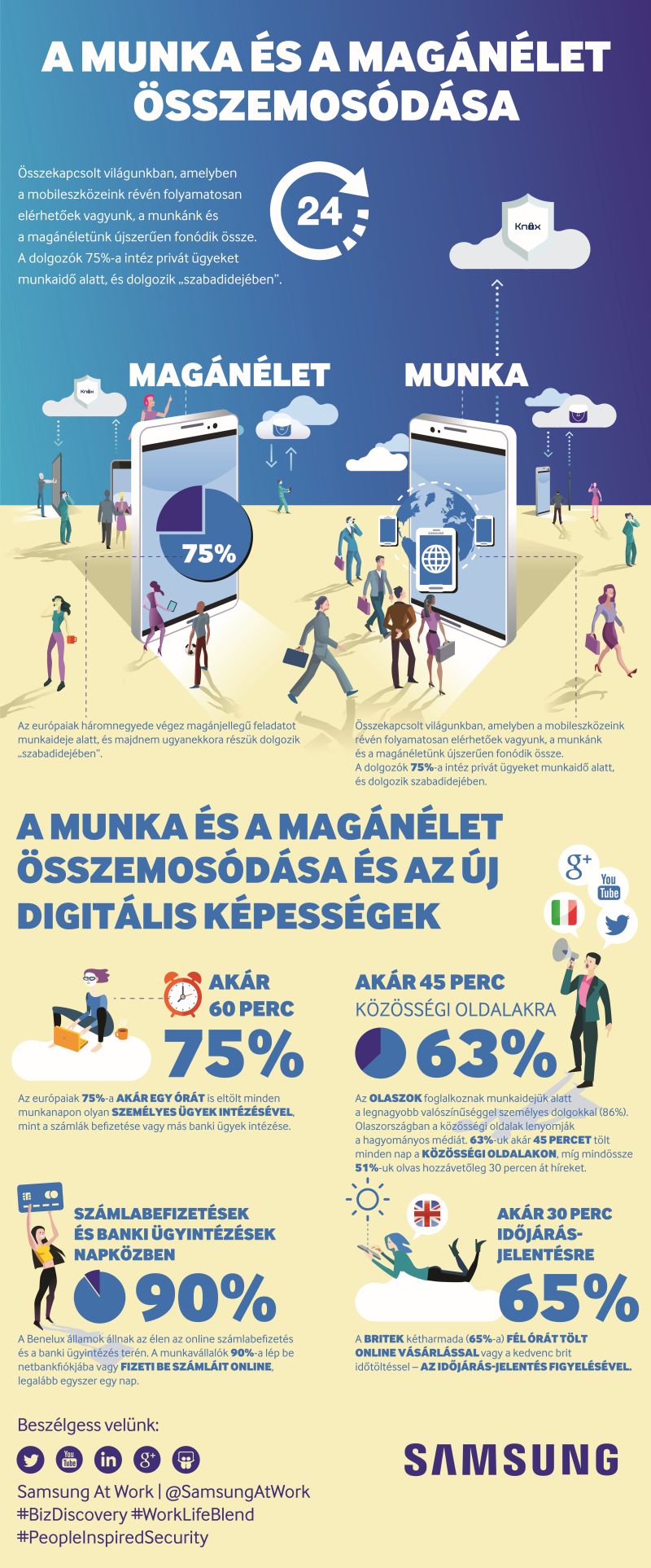 Az európai munkavállalók szerint hatékonyabb, gyorsabb munkavégzés lehetséges, ha az alkalmazottak korlátlan internet-hozzáférést kapnak számítógépükön, mobiltelefonjukon, és ha szabadabban oszthatják be munkaidejüket. A Samsung megbízásából végzett kutatás szerint az európai munkavállalók egyre gyakrabban intézik privát ügyeiket irodájukból, viszont ezzel párhuzamosan jelentősen megnőtt a munkaidőn kívüli munkával töltött órák száma is. A végeredményből pedig nemcsak a munkavállaló, hanem a munkáltató is profitálhat.
