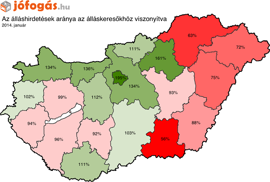 Budapesten a gazdaság még mindig jobban zakatol, mint vidéken: a fővárosban minden keresőre majd’ két álláshirdetés jut. Az online statisztikák alapján főleg az ország nyugati felében akad munkalehetőség - legalább annyi állás van, mint ahány kereső -, Borsodban, Tolnában és Szabolcsban már kevésbé pozitív a mérleg. A legnehezebb helyzetben a csongrádiak vannak: itt kétszer annyian keresnek munkát, mint ahányan munkavállalót.