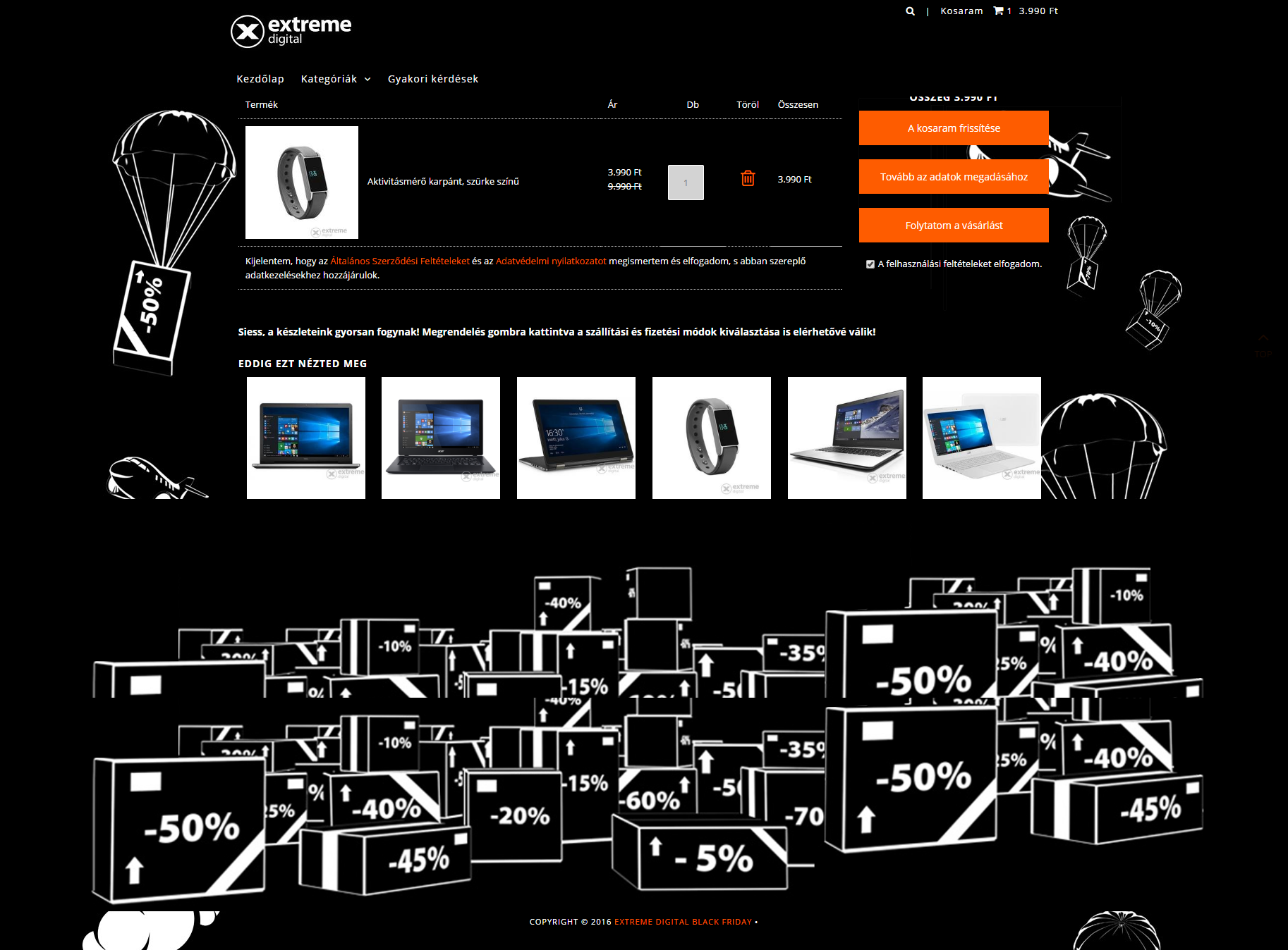 A kifejezetten az akciós napra felhúzott ideiglenes áruházban kizárólag a fekete pénteki akciós termékeket lehet megrendelni, a rendeléshez pedig meg kell adni a név, e-mail cím mellett a szállítási címet akkor is, ha valaki korábban már regisztrált az Extreme Digital webáruházába. Ezzel párhuzamosan a teljes kínálatot tartalmazó áruházi felület is elérhető, ahol a nem akciós termékeket a szokásos módon meg lehet rendelni az éjfélkor záruló fekete péntek alatt is.