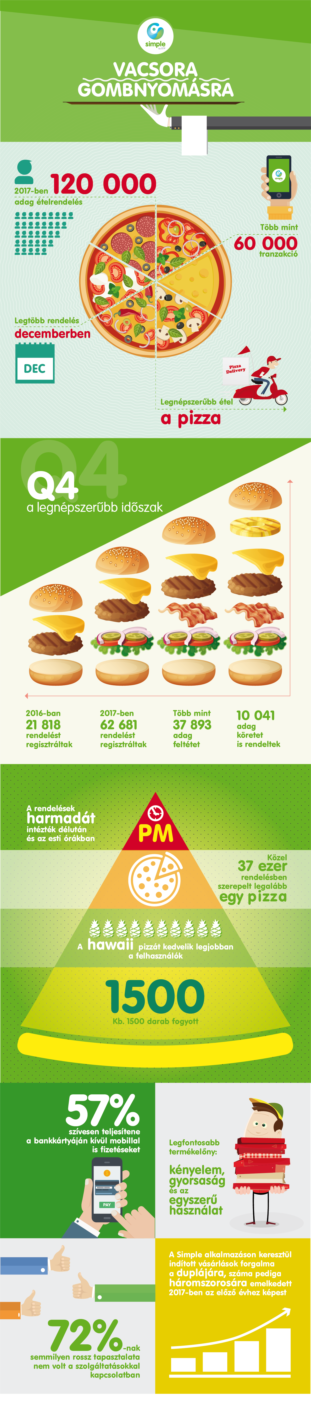 Több mint 120 000 adag ételt rendeltek összesen a Simple alkalmazáson keresztül 2017-ben – derül ki az OTP Mobil adataiból. Az alkalmazás több mint 60 000 tranzakciót regisztrált, elsősorban fővárosi vendéglátó egységekből. A legtöbb rendelés decemberben történt, a legnépszerűbb étel pedig a pizza volt.