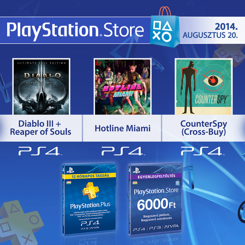 Az e heti PlayStation Store frissítéssel többek között olyan újdonságok váltak elérhetővé az áruházban, mint a Diablo III: Reaper of Souls - Ultimate Evil Edition, a CounterSpy és a The Last Tinker: City of Colors. A Hotline Miami PS4-re szintén megérkezett, amelyet a Cross-Buy támogatásnak köszönhetően ingyen tölthetnek le azok, akik rendelkeznek a PS3 vagy PS Vita verzióval.