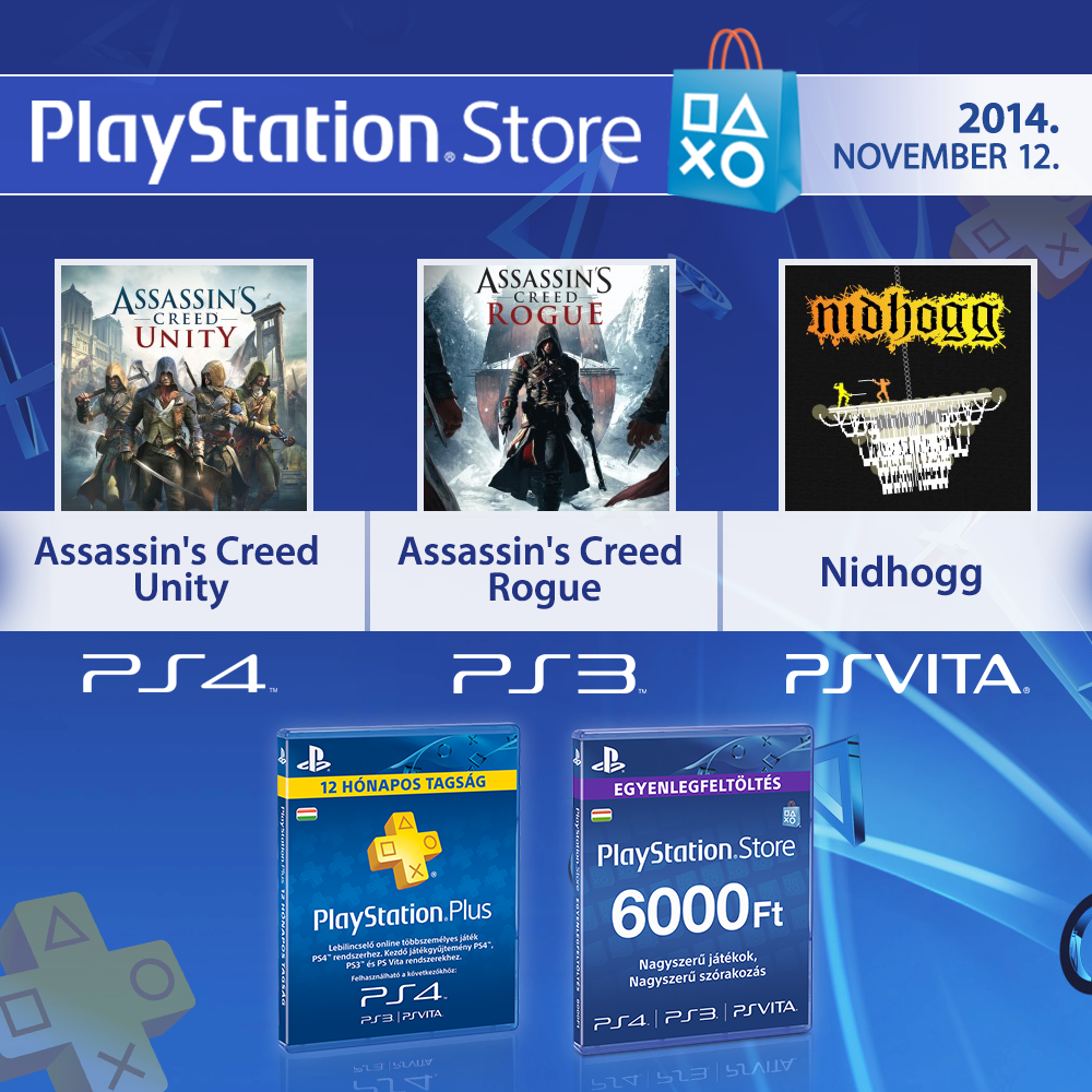 A héten temérdek PlayStation 4 játékkal bővült a PlayStation Store kínálata, hiszen többek között megérkezett az Assassin's Creed Unity, a PES 2015, a Cross-Buy támogatással rendelkező Nidhogg, péntektől pedig a LEGO Batman 3: Beyond Gotham is elérhetővé válik a LEGO-rajongóknak. A PlayStation 3 tulajok sem maradnak Assassin's Creed játék nélkül, hiszen a Rogue alcímmel ellátott epizód már szintén kapható.