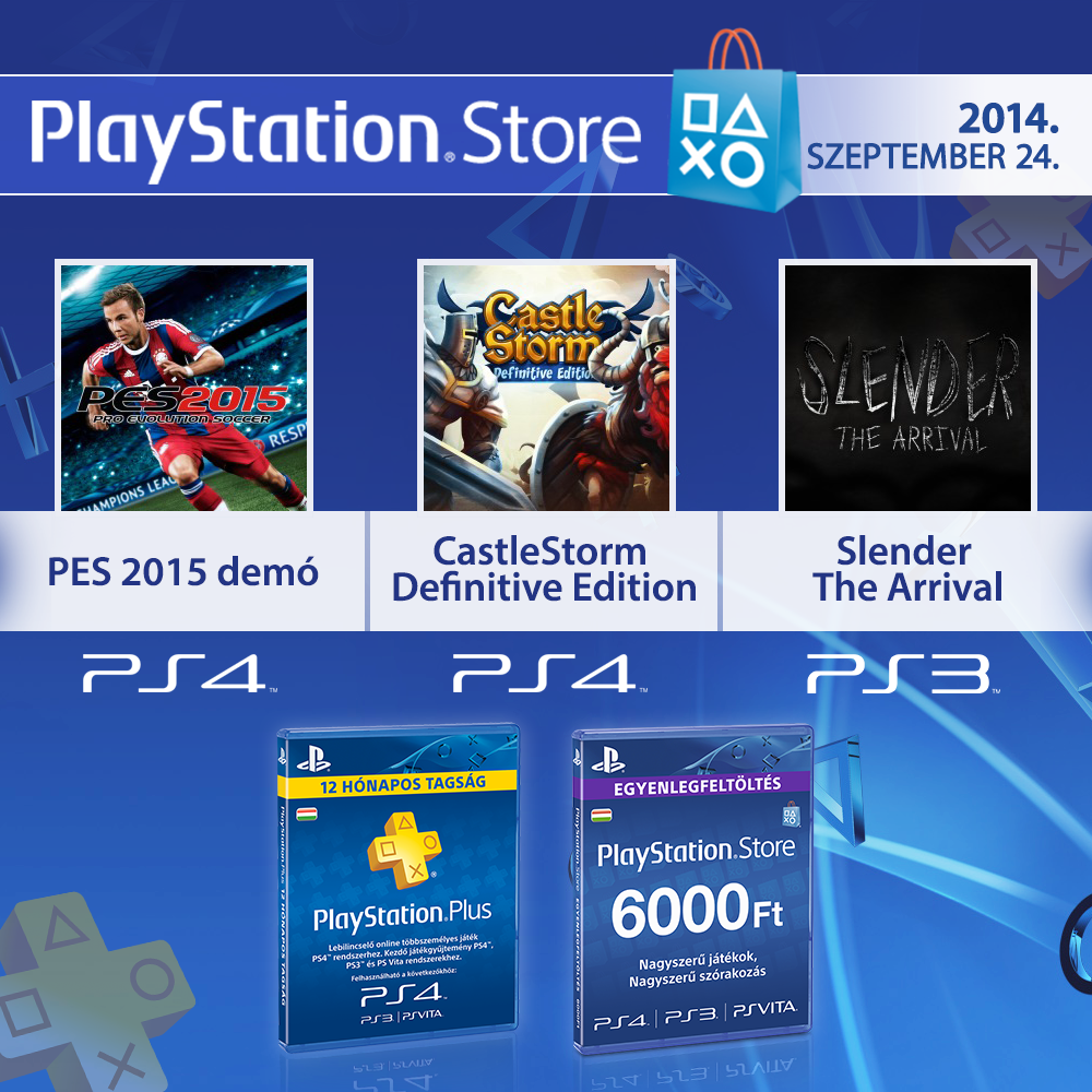 A PlayStation Store e heti frissítésével megérkezett a Pro Evolution Soccer 2015 ingyenes próbaverziója PS3-ra és PS4-re, így a futballrajongók még a novemberi megjelenés előtt ízelítőt kaphatnak a Konami sportjátékából. A PlayStation 3 tulajoknak emellett már kapható a Slender: The Arrival című horrorjáték.