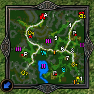Tőlünk keletre egy kétirányú portál fekszik, melyet néhány Zealot véd. A kapu túl oldalán egy combosabb varázstárgy található, így megéri síkra szállni az átjutásért. Ám a tó közepén álló kis sziget egyelőre még túl jó őrizet alatt áll, így a Zealot csoportot elkerülve tartsunk továbbra is északnak. Itt egy Peasant's Hut vár bennünket. Más dolgunk sincs vele, mint lángba borítani, (gyönyörűen hallani a robbanást), s mindezért gazdag jutalom vár bennünket arany és tp formájában. A térképen sajna mindössze 3 Peasant's Hut van.