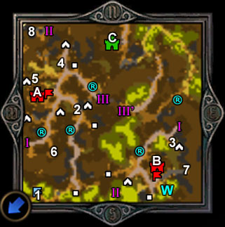 Ahogy a létszám tovább növekszik, megtámadhatjuk a Shadow Dragon-okból és unokatestvéreikből álló csoportokat a 6-os és 7-es pontok alatt. Mindkét győzelem egy kulcs egyik és másik felével ajándékoz meg. Eztán irány az egyirányú portál (III), hogy megkapjuk a Forge meglátogatására vonatkozó quest-et. A Forge (8) a B-vel jelölt várostól délre egy kétirányú kapun keresztül (II) érhető el. A kulcs két fele itt végre egybe kovácsolódhat.
