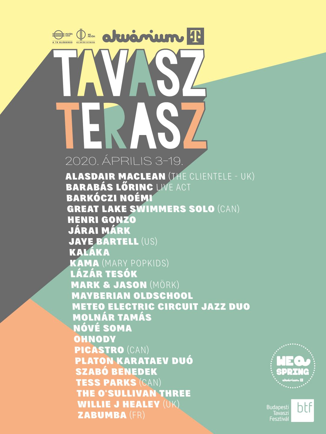 Emellett április 3. és 19. között ingyenes akusztikus koncertet ad majd még a teraszon: a Barabás Lőrinc Live Act, Barkóczi Noémi, Henri Gonzo, Járai Márk,, Kama, a Kaláka, a Lázár Tesók, Mark & Jason a Mörkből, a Mayberian OldSchool,a Meteo Electric Circuit Jazz Duo, Molnár Tamás, Nóvé Soma, Ohnody, a Platon Karataev duó, Szabó Benedek és a The O'Sullivan Three. A Tavasz Terasz programját két kanadai előadó, a Picastro és a Great Lake Swimmers akusztikus fellépése zárja.