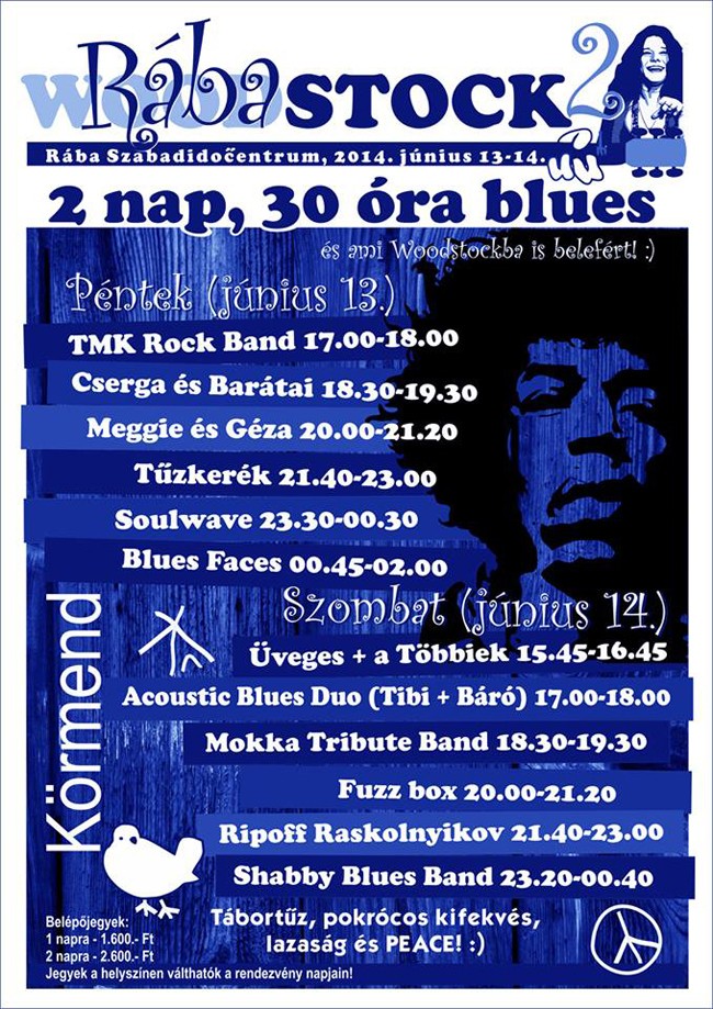 A Rába Szabadidőcentrumban pénteken fellép a TMK Rock Band, Cserga és Barátai, Meggie és Géza, a Tűzkerék, a Soulwave és a Blues Faces. Szombaton az Üveges + a Többiek, az Acoustic Blues Duo, a Mokka Tribute Band, a Fuzz boksz, Ripoff Raskolnyikov és a Shabby Blues Band állnak színpadra.