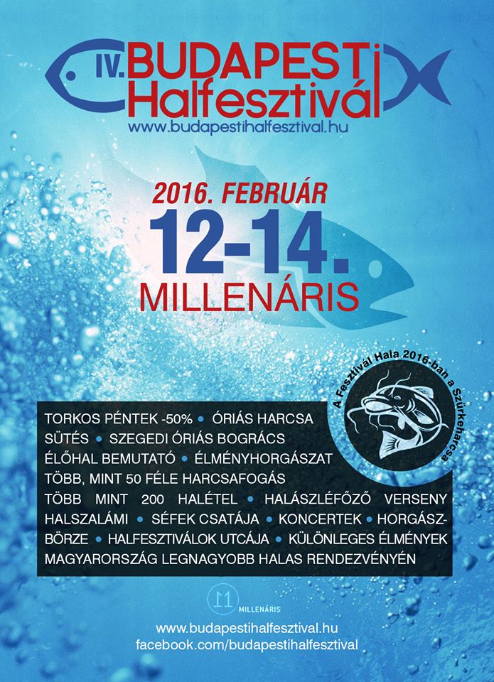 A IV. Budapesti Halfesztivál 2016. február 12-től 14-ig várja a halételek szerelmeseit új helyszínen, a budapesti Millenáris Parkban. Európa legnagyobb halfesztiválján az idei évben több mint 200 kiállítóval találkozhatnak, akik számos különlegességgel, például szegedi óriásbográccsal és óriás harcsasütéssel készülnek. A szervezők ígérete szerint a gasztrofesztiválon minden halból lesz, még a kolbász is. A látogatók világkonyhával, halászléfőző versennyel, a legkiemelkedőbb hazai séfek halpárbajával és külföldi halételekkel is találkozhatnak.