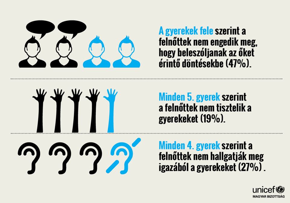 Az UNICEF Magyar Bizottsága 2014 őszén végzett nem reprezentatív kutatást 1191 fő, 10-19 éves általános- és középiskolai diák körében a gyermekjogokról. Az eredményekből kiderül, hogy: