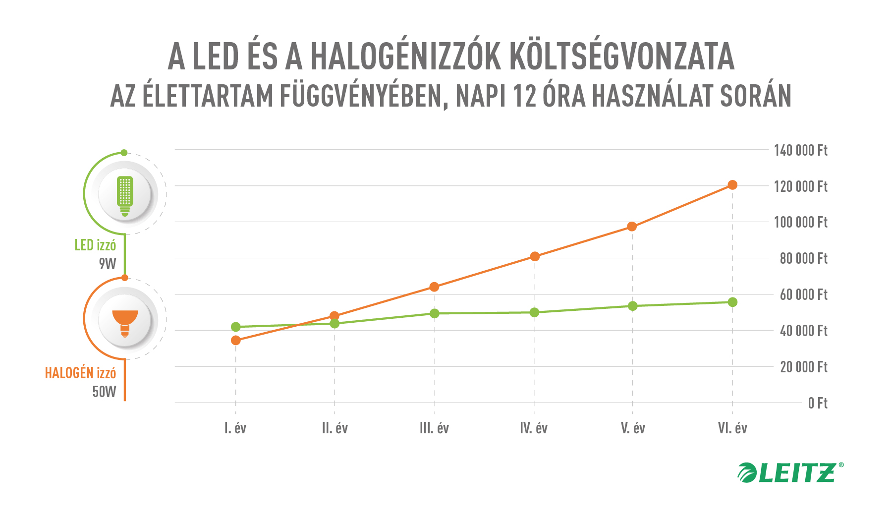 Az innovatív, egyedi világítási megoldásokat forgalmazó ausztráliai cég, a Lumitex például egy nagy fényerejű, 9 Wattos LED lámpa és egy 50 Wattos halogénizzó élettartamát vizsgálta napi 12 óra használat során 6 éven keresztül, és meglepő következtetésekre jutott. A felmérés eredményei azt mutatták, hogy a kezdeti költségekben jelentkező különbségek hosszú távon lényegtelenné válnak a hosszú élettartamnak és az energiafogyasztásnak köszönhetően.