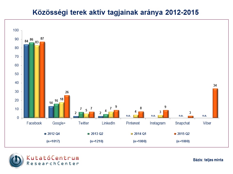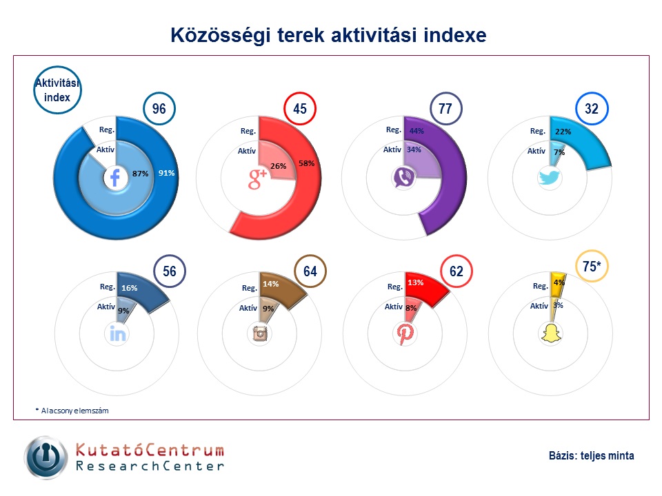 Bár a felmérésben részt vevő közösségi terek – a Facebook, Google+, Twitter, LinkedIn, Pinterest, Instagram, Snapchat és Viber – regisztrálóinak száma jellemzően évről évre növekszik, ez azonban nem feltétlenül jelenti az aktív használói bázis növekedését is. „Az aktivitási index a Twitter és a Google+ esetében az 50 százalékot sem éri el. A sort hazánkban továbbra is a Facebook vezeti 97 százalékos aktivitási rátával, a második helyen található Viber esetében 77 százalék ugyanez az arány" – emelte ki Balogh Szilvia. A képek figyelemmegragadó ereje a használat gyakoriságában is visszaköszön: mind a Pinterest, mind az Instagram aktivitási rátája meghaladja a 60 százalékot.