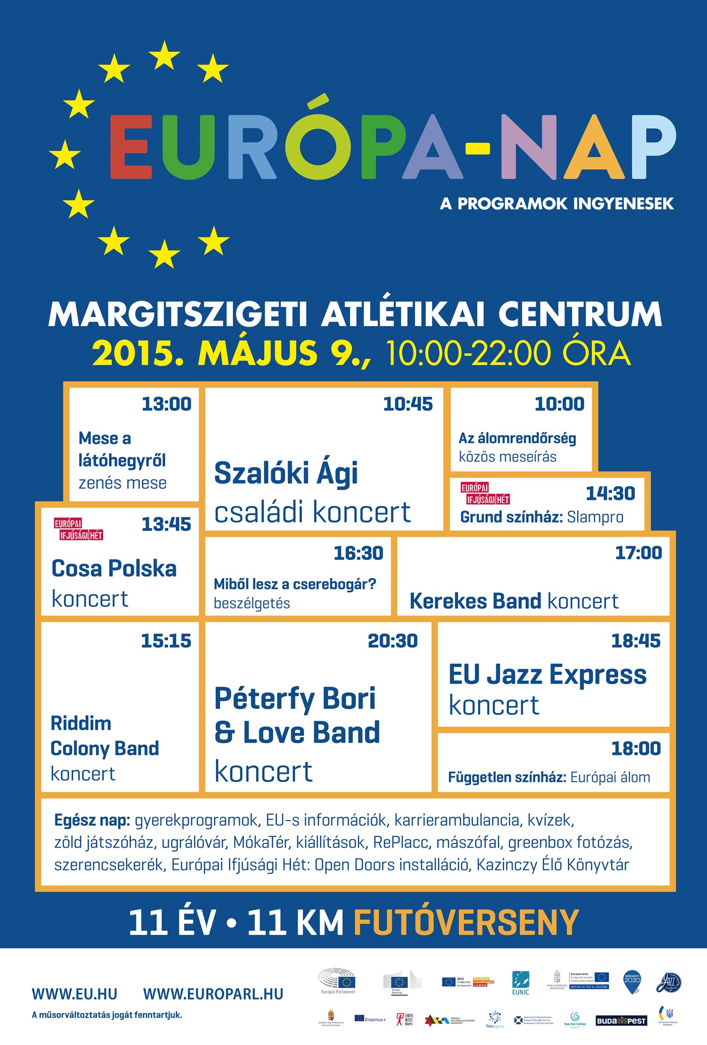 Szilágyi Áron olimpiai bajnok kardvívó és Molnár Andi versenytáncos együtt állnak rajthoz a Magyarország európai uniós csatlakozásának 11. évfordulóját ünneplő 11 kilométeres futóversenyen. A Budapest emblematikus helyszíneit érintő futás mellett a Margitszigeti Atlétikai Centrumban egész napos Európa-napi fesztivál várja az érdeklődőket színházi és gyermekprogramokkal, valamint Péterfy Bori & Love Band koncerttel.