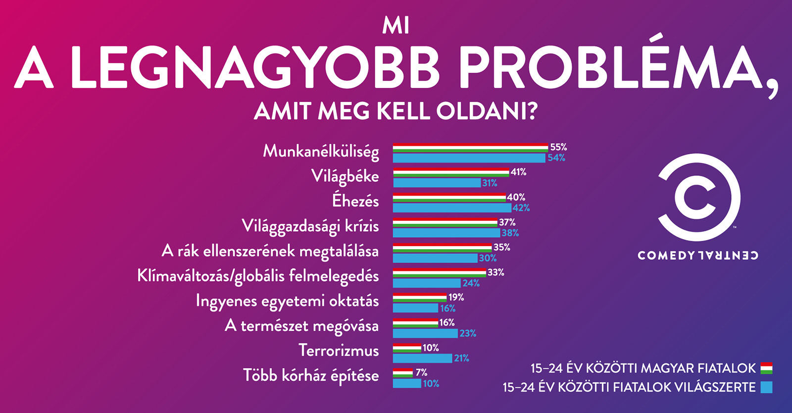 A humorcsatorna reprezentatív felmérésében arra a kérdésre, hogy mi a legnagyobb probléma a világon, a magyar ifjak 55%-ban jelölték be a munkanélküliséget (54% a világátlag). A globális éhezés és a gazdasági krízis ugyanannyira foglalkoztatja a hazai válaszadókat, mint a többséget, ám hogy a magyarok romantikus lelkek, jól bizonyítja, hogy 41% szerint szükség lenne „boldogságot hozni” a világra. Összesítésben 31% gondolkodott erről hasonlóan. A terrorizmustól fele annyian tartanak idehaza, mint a nagyvilágban (10% a 21%-al szemben).