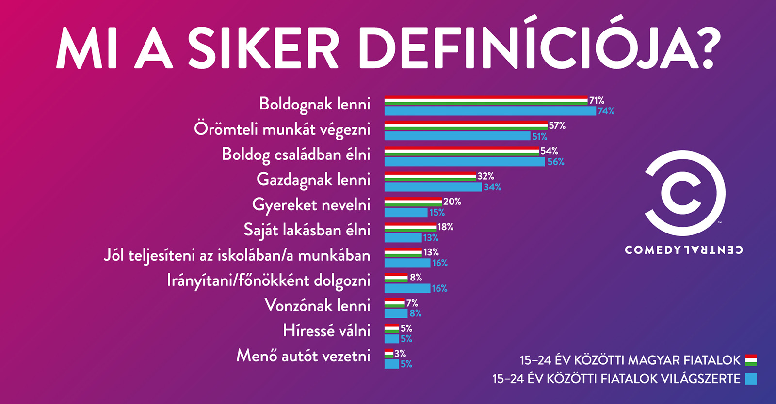 „Sírva vígad a magyar” – tartja a mondás és erre a Comedy Central felmérése is rámutat. A magyarországi fiatalok 62% vallja boldognak magát, ami nem sokkal marad el a nemzeteken átívelő átlag 70%-os boldogságérzettől. A kutatás szerint a mexikói fiatalok érzik magukat a legjobban a világon (93%), őket követik az argentinok (87%) és a brazilok (84%). A felmérés egy pontján a fiatalokat arra kérték, hogy definiálják a siker fogalmát. Itt teljes az összhang: a három legfontosabb tényező, ha az ember boldog, van egy szerető családja és olyan munkája, amit élvez. A magyar fiataloknál az utóbbi kettő helyet cserél, vagyis egy jó munkahely fontosabb a családnál.