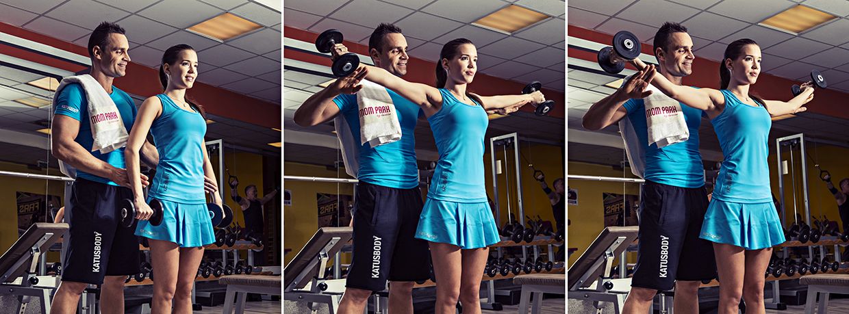 A vállizom hátsó részére rendszerint kevesebb figyelmet fordítunk. Az alábbi négyütemű gyakorlat elvégzésével azonban ez az izomköteg is nagyobb hangsúlyt kap. Állj egyenesen, vegyél mindkét kezedbe egy-egy súlyzót, a karjaidat pedig engedd le a tested mellé. Emeld oldalirányba enyhén hajlított karjaidat úgy, hogy a tenyered hátrafelé néz. A mozgás felső fázisában fordítsd a tenyered fölfelé, majd vissza, végül engedd le a karjaidat a kiinduló helyzethez.