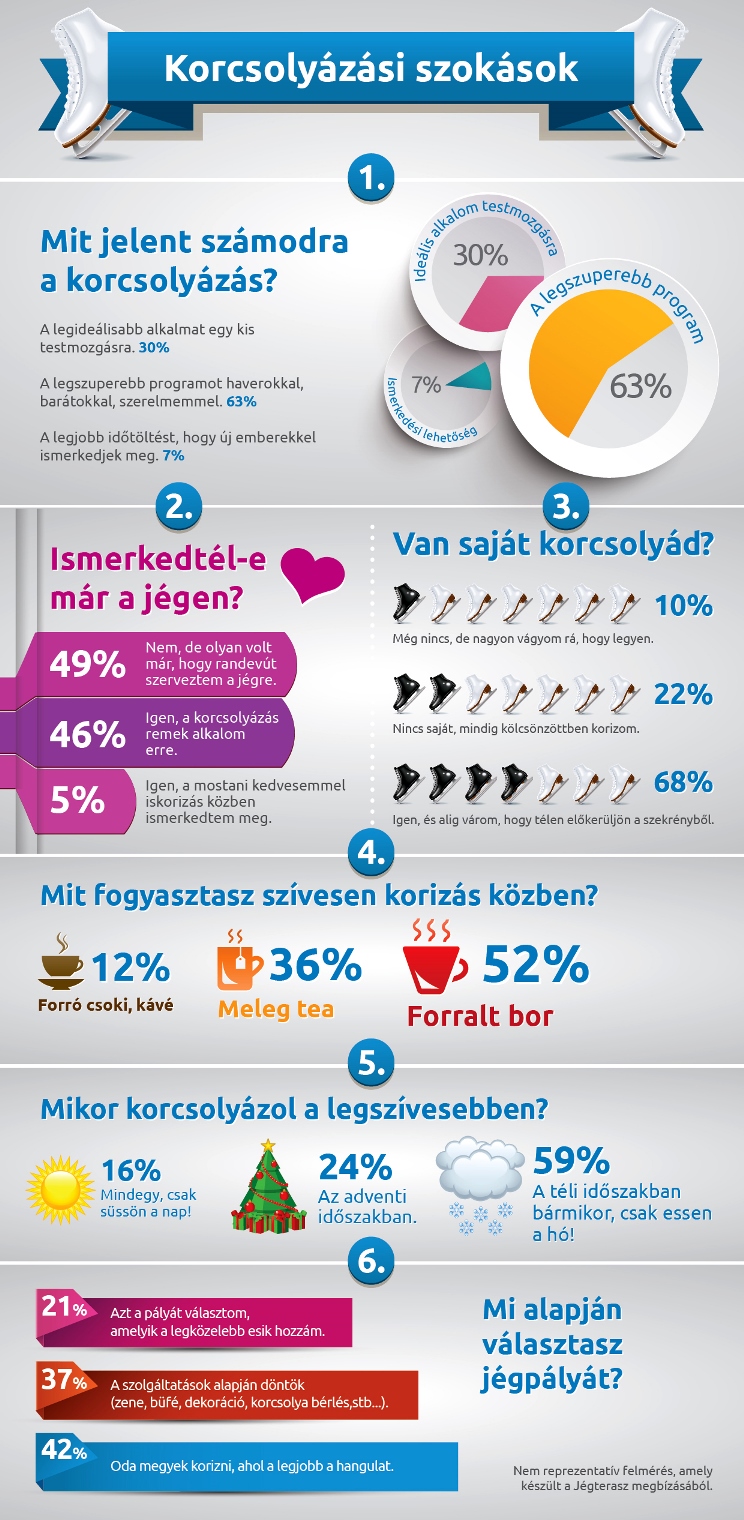A nem reprezentatív felmérés válaszadóinak harmada a jégpályán hangolódik az ünnepekre, míg döntő többségük (59%) bármikor kapható a korcsolyázásra, csak essen a hó. 16%-uk nyilatkozott úgy, hogy a téli időszakban akkor legjobb korit húzni, ha süt a nap. A hideg időben a korcsolyázók fele legszívesebben forralt bort fogyaszt lélekmelegítő gyanánt, körülbelül a harmaduk a meleg teára esküszik, míg 12% a forró csokit vagy a kávét szereti két csúszás között.