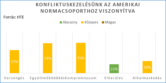 Az amerikai konfliktuskezelési stratégiákat összefoglaló tanulmány után Magyarországon is felmérték az ilyen irányú attitűdöket. Kiderült, versengésünk a tengerentúliakhoz képest közepes szinten áll, a lehetséges összeütközéseket sokkal kevésbé kerüljük el, és bár együttműködésben és kompromisszumkészségben az amerikaiakhoz hasonlatos szinten állunk, nem szívesen alkalmazkodunk.