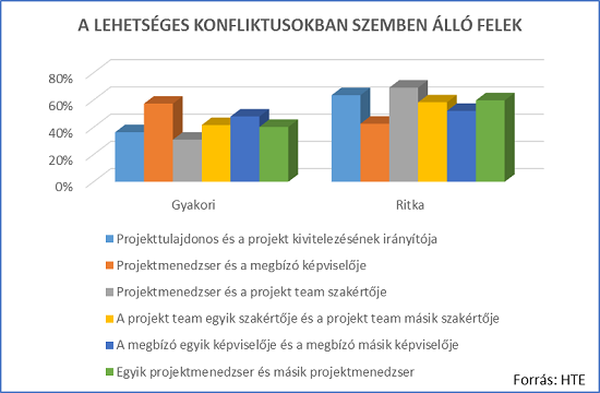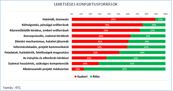 Arra a kérdésre, hogy hol és milyen tényezőkkel kapcsolatban merülnek fel leginkább konfliktusok egy munka során, a válaszadók többsége a határidőt jelölte meg, 89%-ban ezt tartják a legégetőbb problémának. A következő összeütközési pontot a költségvetés jelenti, a válaszolók 76%-a kedvezőtlennek ítéli a pénzügyi erőforrásokat. Szintén jelentős mértékben okoz gondot az emberi erőforrás hiánya, amely 73%-ot kapott a konfliktusforrások listáján. Az információátadást, a hatáskörök megosztását és a különböző hatalmi játszmákat nagyságrendileg ugyanannyian értékelik megfelelőnek, mint működésképtelennek. Legkevesebb panasz az alkalmazott módszertanra érkezett (13%), emellett a szakmai hozzáértéssel is általánosságban elégedettek (29%) a szakemberek. Az összesítésből úgy tűnik, a szakmaiság zökkenőmentes, a konfliktusokat jóval inkább a csapaton kívülálló tényezők határozzák meg.