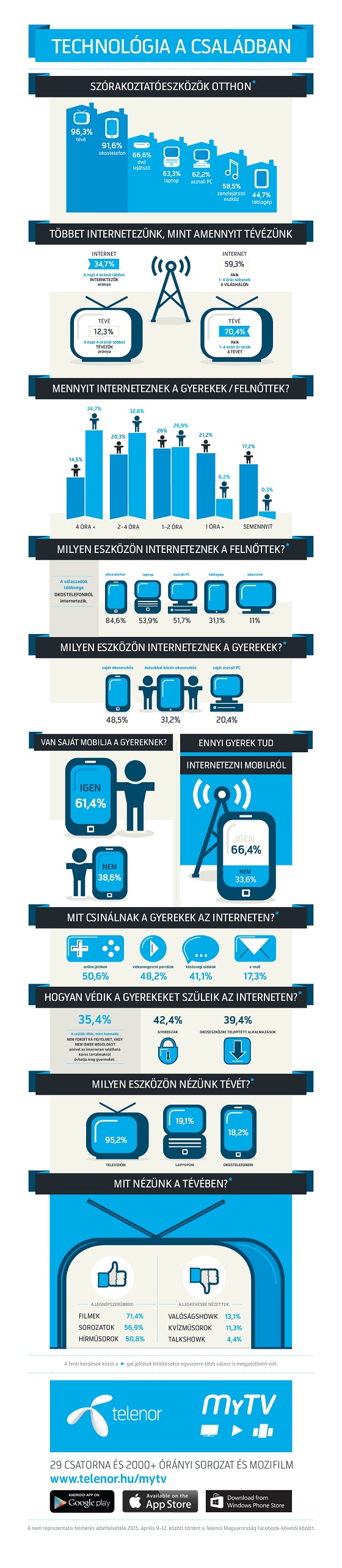 A magyar felnőttek több időt töltenek internetezéssel, mint a tévé előtt – derült ki a Telenor legújabb online felméréséből. A kutatás arra kereste a választ, hogy milyen szerepet tölt be a technológia a hazai családok életében. A válaszokból az is kiderült, hogy a gyerekek többsége internetképes telefonnal rendelkezik, a szülők azonban egyelőre nem fordítanak elegendő figyelmet a kicsik netes védelmére.