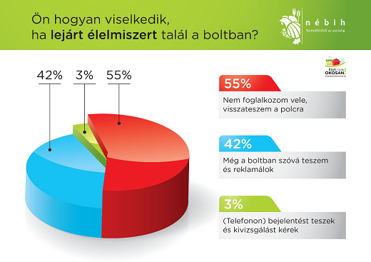 A válaszadók több mint fele (55%) nem foglalkozik azzal, ha lejárt terméket emel le a polcról. Mivel úgy gondolják, hogy az árukészlet hamar cserélődik, szó nélkül visszateszik a többi közé. A vásárlók negyede (42%) ennél jóval tudatosabban cselekszik, és még a helyszínen szóvá teszi, jelzi észrevételeit. Telefonos bejelentésig, és ezzel hivatalos kivizsgálás kérvényezéséig pedig csak a válaszadók elenyésző hányada, alig 3%-a jut el. A vizsgálat nem tárta fel, hogy a vásárlók miért nem vállalják fel az üzletben a hiba jelzését, holott a probléma gyors és legegyszerűbb kezelésének ez lenne a módja.