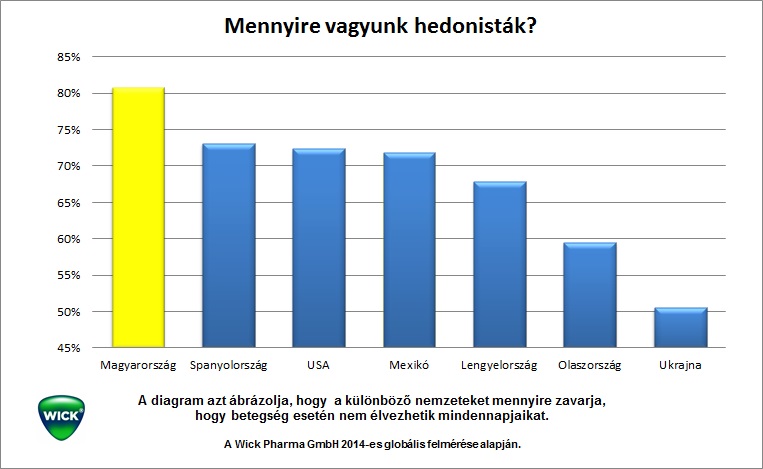 A felmérés készítői arra is kíváncsiak voltak, hogy mi zavar minket a legjobban egy megfázás esetén. Nemzetközi szinten kimagasló eredményt értünk el abban, hogy azt viseljük a legrosszabban, ha nem élvezhetjük az életet. A megkérdezettek 80%-a mindennél előrébb valónak tartja, hogy megélhesse a mindennapok kellemes pillanatait, náthásan pedig nem tudja úgy élvezni az életet, ahogy szeretné. Ezzel a kimagasló számmal olyan, a jókedvűkről híres országokat utasítottunk magunk mögé, mint Spanyolország (73,1%) vagy éppen Olaszország (59,5%). Rólunk, magyarokról mindig is az a hír járta, hogy szeretünk enni, inni és élvezni az élet minden pillanatát. Ez a legenda most már tény, hiszen számok is bizonyítják, hogy hedonista nép vagyunk.