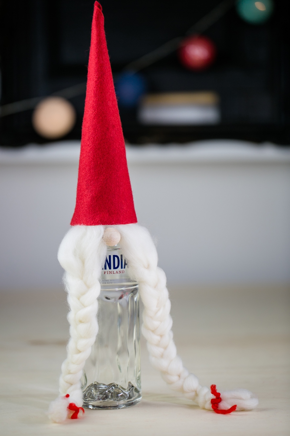 Az „igazi” lappföldi Mikulást idézi a következő megoldás, amivel például a nagypapádnak szerezhetsz örömet. Ehhez szükséged lesz egy A4-es méretű, 2-3 mm vastag filc lapra, egy köteg mesefilcre és egy 2 cm átmérőjű fagolyóra. Képezz egy gúlát a filclapból, és ragasztópisztoly segítségével rögzítsd a szélét. Mérd rá az üvegedre, és vágd megfelelő hosszúságúra. Ragaszd bele a sapkába a mesefilcet, és ha fonott hajat szeretnél, készítsd el a copfokat. Végül helyezd az üvegre és az orrot gyurmaragasztóval vagy ragasztópisztollyal rögzítsd a helyére.